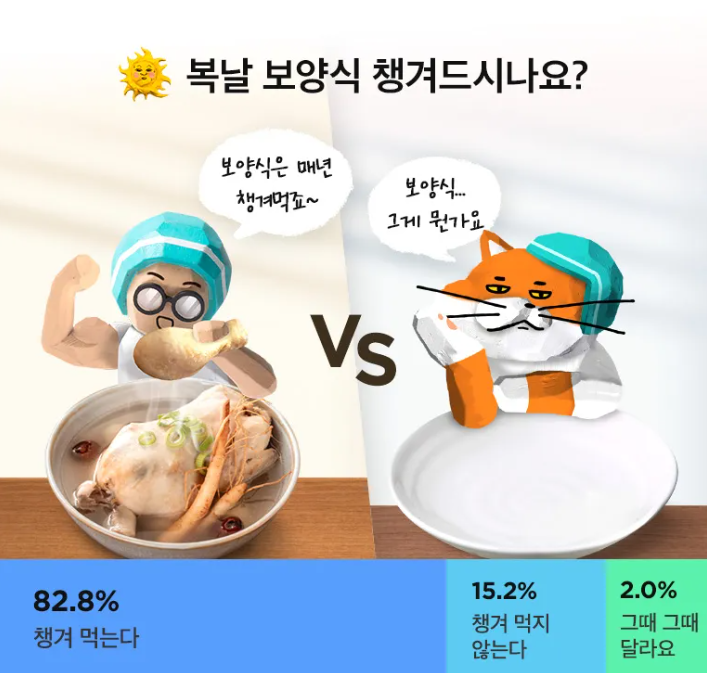 배달의민족 설문조사에 따르면, 10명 중 8명이 복날에 보양식을 주문해요. 특히 초복(7월 15일)에 가장 많은 주문이 몰리고, 삼복을 모두 챙긴다는 비율도 41.4%로 10명 중 4명이 보양식에 진심이에요. 복날 보양식 중 가장 인기 있는 메뉴는 삼계탕(61.9%)과 치킨(21.2%)으로, 복날 부동의 1위를 당당히 지키고 있어요. 복날에 가족, 회사 동료, 친구들과 함께 삼계탕을 먹는 모습을 상상하면, 그야말로 한국의 여름 풍경이 아닐까요? |