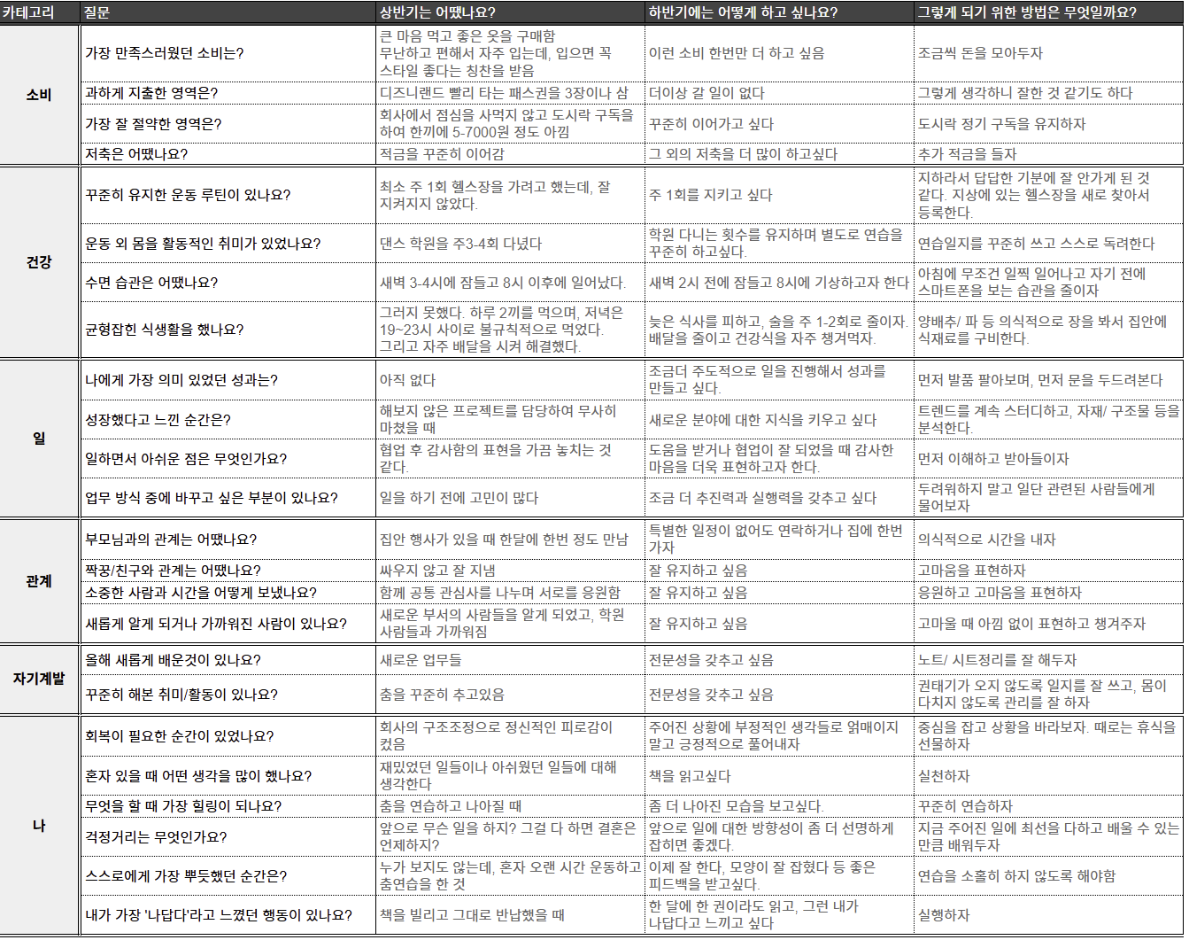지나온 6개월, 무심히 흘려보내기엔 아쉬운 순간들이 분명히 있었을 거예요. 이 표는 그 시간을 잠깐 멈춰 세우고, 나를 다시 바라보는 정리표입니다. 소비, 건강, 관계, 일, 자기계발, 그리고 ‘나’라는 카테고리까지 상반기를 돌아보며 루틴을 리셋하여, 하반기를 더 ‘나답게’ 시작해 보세요.